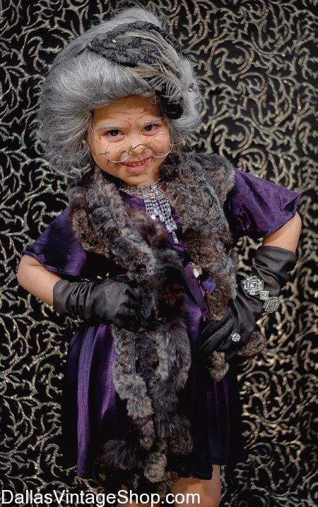 Here is one elegant 100 yr. old lady outfit from Dallas Vintage Shop. It’s great for little kids to wear for a quality 100th Day School, Old Lady Costume. This 100 yr. old lady outfit includes an elegant little old lady child size dress, glamorous grandma fashionable wigs, gloves, faux fur shoulder wrap, nice looking Granny glasses and all the little old lady accessories for little girls you need.