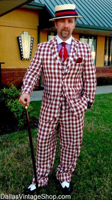 Here is one Dapper 1920’s Jazz Age Gentleman in his 1920’s Checker Board Suit, Skimmer Hat, Art Deco Tie & Pocket Square wearing Jazzy Wing Tip Spat Shoes and holding a Vintage Style Walking Cane. This 1920’s Summer Jazz Festival Costume is quick and easy to assemble, on the spot at Dallas Vintage Shop because we have more 20’s Era Clothing, Costumes and Accessories than any Men’s Store or Costume Shop in the Metroplex or Anywhere. Get Superior 20’s Complete Outfits or just the Economy or Median Priced 1920’s Costumes or just the Accessories you need.