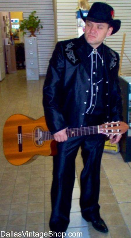 Get Complete Costumes for Famous 1950’s Men, like this Johnny Cash, Country Music Artist Costume for “I Walk the Line,’ Movie. ‘Folsom Prison Blues,’ first Released in 1955, made Johnny Cash famous. The Song ‘I Walk the Line,’ was actually written & released in 1954 and later became the Album by the same name in 1964. This 1950’s Character Costume is just one example to the Quality & Diversity of our Encyclopedic Collection of 1950’s High Quality Outfits, Vintage Clothing, Retro Attire and Theatrical Costumes & Accessories we keep in stock all year round. We have the largest collection of 1950’s and other Decades Costumes in the Dallas, North Texas Area or Anywhere. Get Supreme Quality Outfits or Median & Economy Theatrical or Theme Party Costumes.