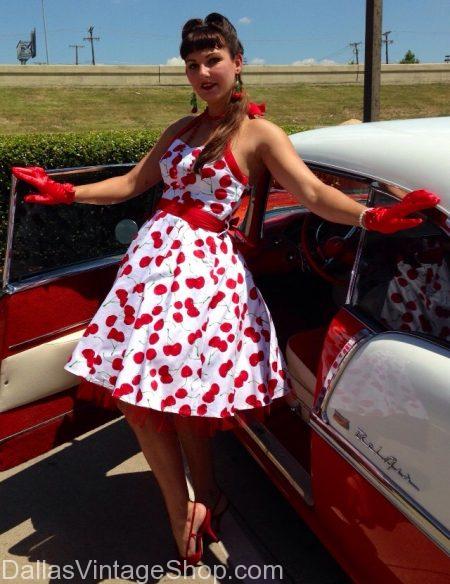 Get 1950’s Youth Fashions like this Wild Cherry Print Dress. This 1950’s Hot Rod Pin Up Dress is great for Vintage Auto Show Models, 50’s Pin Up Fashion Shoots, 50’s Sock Hop and 50’s Dinner Waitress Attire. We have tons of 1950’s Bright & Cheerful, Colorful & Youthful Fashion Ideas like this 1950’s Style Day Dress and all the Nifty 50’s Costume Accessories to match this dress or whatever dress you choose. We have 50’s Day Gloves, 50’s Hairdo Wigs & Pin Up Wigs too. We’ll accessorize your 50’s Outfit from head to toe or you can get just the nice 50’s clothing or accessories you need. Don’t forget, we have many, many 50’s Styles in Plus and XL Sizes too. From 50’s Sun Dresses to 50’s Cocktail Dresses from 50’s Rockabilly Fashions to Casual 50’s Period Outfits and Formal Attire, we have it all. Here you will find the largest collection of 1950’s Clothing & Costumes in the Dallas, DFW or North Texas Area. Get a Theatrical Wardrobe or Stage Production Leading Characters Outfits. Get one 1950’s complete High Quality Outfit or just the 50’s Dresses or Accessories you need. We are here all year round to meet your 1950’s Costume needs.
