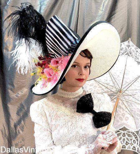 2025 Mad Hatter’s Tea Hats are a specialty of Dallas Vintage Shop as well as Kentucky Derby and Lone Star Park Bodacious Derby Day hats. The famous Audrey Hepburn, My Fair Lady hat, shown here, is just one example of the kind of Golden Age of Hollywood Glamorous Hats we can create for you. See more Ladies Hats here.