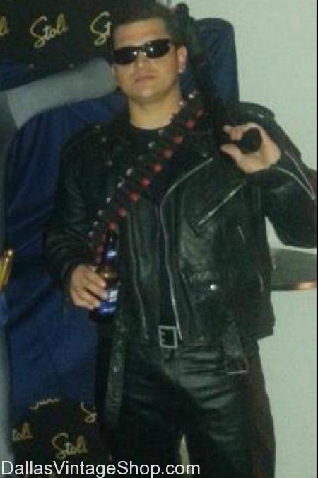 Terminator is one popular classic men’s costume! This Leather, head to toe outfit is perfect for Sci Fi, Cosplay, DC Comics, Super Villain turned Hero, Comic Con, A-Kon, Fen Con, Fan Expo, Time Travelers, Futuristic, Dystopian, Celebrity or Movie Character Costume Theme Party Ideas. It’s a Manly Man’s Choice Costume and Dallas Vintage Shop has tons of Leather Biker Jackets & Leather Jeans as well as all the other Assault Weapons & Gear you could possibly need.