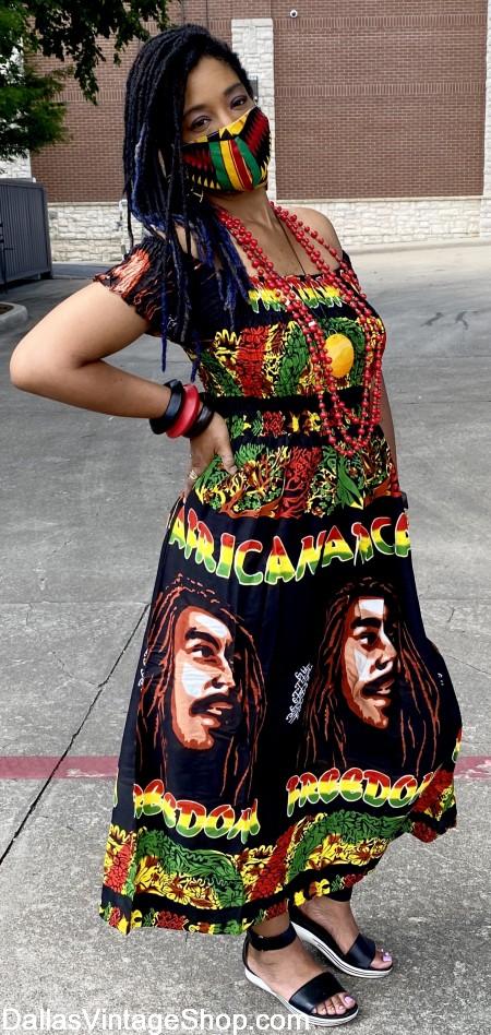 Find African Print, Rasta Print and many other African Fashion Choices in stock. Our absolutely beautiful African Costumes, Robes, Dresses, Necklaces, Jewelry and Face Masks will be everything you need for great Juneteenth, Kwanzaa, Black History Month & School Project Historical Black American Costumes or for everyday attire.