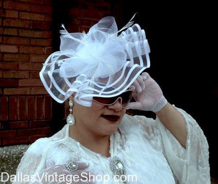 You will never find a hat shop with more All White Ladies Hats, Fascinators, Whimsys, Derby Dame & Fancy Church Hats than Dallas Vintage Shop. Our selection is huge, the diversity is unbelievable and we have all the other accessories or even complete outfits, in all white to match. Get just the hat or let us help you create the outfit of your dreams. We have unbelievable choices for men too.