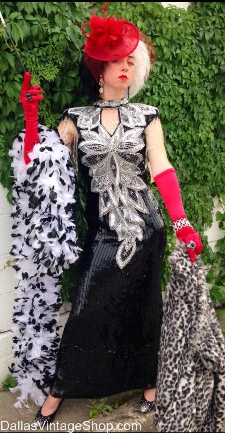 This Glamorous Villain Cruella De Vil Gala Attire is only one idea we have for this Classic Movie Villain. We have a variety of Dresses, Gowns, Boas, Hats, Wigs, Gloves, Jewelry, Cigarette Holders and more, that you can use to create your own Villain Characters. Any Movie Villain Characters, Any Period Villain Characters, Any Historical Villain Character, Favorite Child Movie Villains, Cartoon Character Villains, Cosplay Villains, Best Female Villains, Cruella De Vil Villain Wig, Cruella De Vil Villain Dress, Cruella De Vil Villain Black & White Dress, and all the other Villain Costume Characters you can imagine. Nobody in the Dallas, DFW or North Texas has a larger selection of Supreme Quality Villain Character Costumes. We also have Median Quality and Economy Priced Costumes for Villains and we are open all year.