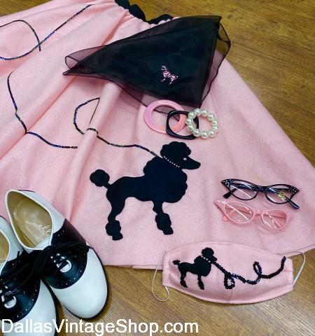 Get Cloth Face Coverings, with or without complete matching outfits. This 50’s Sock Hop, Poodle Skirt themed ensemble is just one idea we have in stock at Dallas Vintage Shop. Ask about other Themed Face Masks. Nothing will prevent you from looking fashionable, not even a pandemic.
