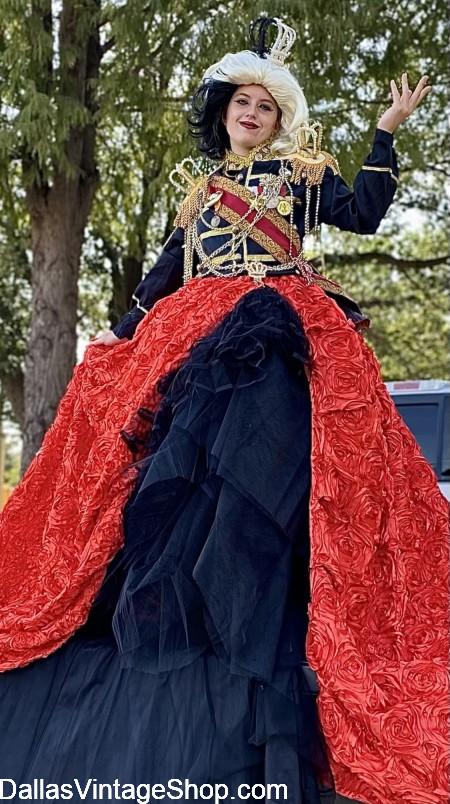 No matter what your favorite Cruella De Vil Costume is, we will have it at Dallas Vintage Shop. This Avant Garde, Parade Scene, Red Dress Outfit is absolutely amazing. Let us hook you up with the Movie Villain Costume of your dreams. We are open all year round.