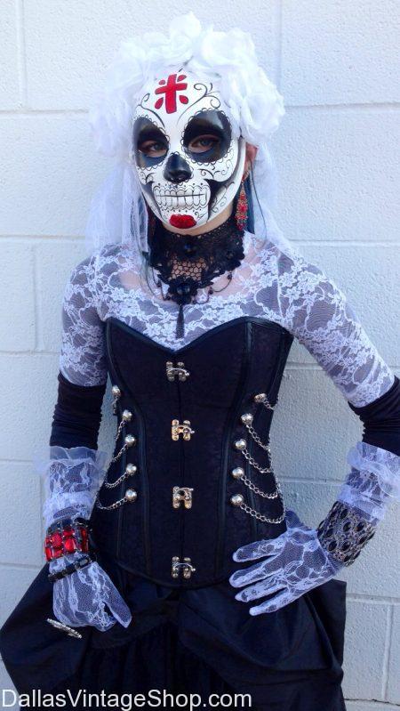 We have the Largest and Most Comprehensive Collection of Day of the Dead Ladies Costumes and Accessories in the Metroplex. Get Dia de los Muertos Masks. We have a ridiculously huge selection of Day of the Dead Ladies Costume Ideas including Day of the Dead Romantic Goth Attire, Day of the Dead Quality Masks, Supreme Quality Corsets, Ben Nye Dia de los Muertos Makeup and other brands, Lace Bride Dresses, Tops & Leggings, Black or White Lace, Satin or Velvet Gloves, Amazing Gothic Victorian Chokers & Jewelry, and an incredible collection of Unique Day of the Dead Accessories you will not see anywhere else.. Come assemble your own Day of the Dead Creation from Supreme Quality Attire or Median and Economy Costumes and Accessories. Shop Early for Dia de los Muertos. We are open all year.