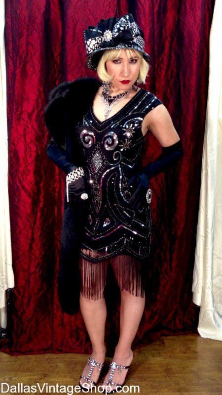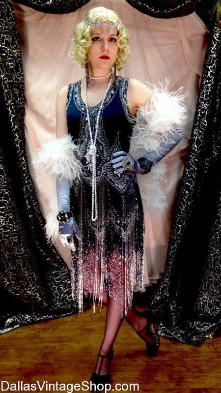 JUST TAKE A LOOK AT OUR Ritzy 1920’s Prohibition Attire, Glamorous Beaded 1920’s Flapper Dresses & OUR HUGE SELECTION of the best fashions of the 20’s Era and you will be amazed. Get Superior Quality, Median or Economy Complete Outfits or just the Dresses or Accessories you need. Yes, we’re open year round. Come see the unbelievable inventory of 20’s Beaded or Fringe Gala Gowns & 20’s Flapper Dresses. Choose from an enormous collection of Cloche 20’s Hats, Art Deco, Art Nouveau & 20’s Fashion Jewelry. Don’t forget the 100’s of Styles of 20’s Flapper Headbands & Tierras. Get the Evening Gloves, the Seamed Stockings, Long Strands of Pearls and the 20’s Style Shoes like the ladies of the 1920’s wore. Oh, we have many styles and length of 20’s Cigarette Holders, Cigarette Cases, Cigarette Lighters and 20’s Shoulder Bags. We stay fully stocked. Our 20’s designs are perfect, our variety is overwhelming and our prices go from Celebrity Status Quality to School Project, Theatrical or Halloween Costume Prices. Our 20’s Gala Fashions and Flapper Dresses go up to 3x, 4x and often higher. We are open all year round to serve Dallasites, North Texans, New Yorkers, Californians and Internationals. Its worth the drive or flight to Dallas Vintage Shop to get the complete 20’s Outfit you’ve dreamed of. Feel free to call ahead for some reassurance that we will be able to meet your need. We are happy to serve you.