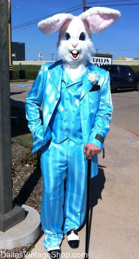 How do you like this Cheerful Easter Bunny Mascot? This is just one of our complete bunny costumes in stock, There are other bunny suits too. You may prefer to wear a white tuxedo, one of our spring brightly colored suits or a cheerful vests & bow tie combo with one of the bunny mask we have in stock. Go Dapper, Vintage, Springy, Hip Hop, Preppy or Formal. We have ideas.