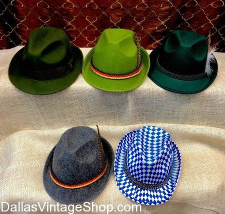 Oktoberfest Alpine Hats & Feather Hat Pins Galore! We Have Oktoberfest Hats including German Alpine Hats. From Traditional German, Tyrolean, Bavarian, Austrian & Alpine Hats to Festive Oktoberfest Costumes, Lederhosen and Caps, Dallas Vintage Shop has the German Hats and Outfits for you!