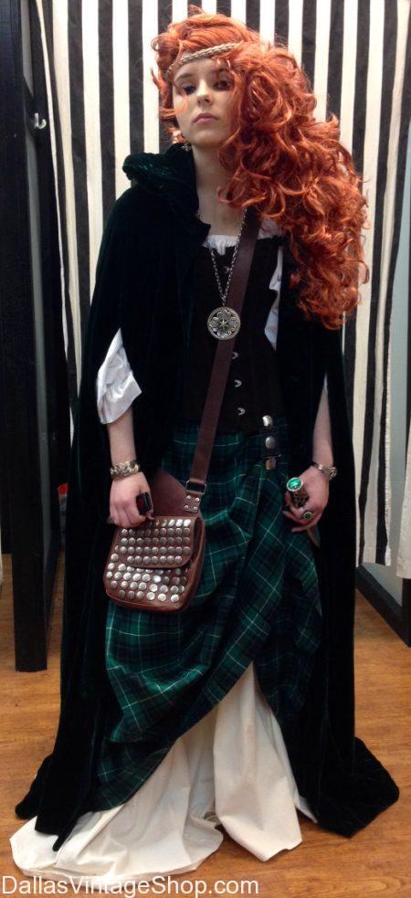 Find Quality Irish Attire & Costumes at Dallas’ largest Irish Costume Shop. Get St. Patrick’s Day & Irish Attire for Irish Festival Costumes. We have Supreme Quality or Economy Irish Attire for Irish Ladies, Men, Children, Historical, Celtic, Folklore and St. Patrick’s Day Parade & Celebration Costumes, Wardrobes & Accessories. This Quality Corseted Irish Lady is wearing her Irish Tartan Skirt over long petty coat skirt, Irish Peasant Blouse, Cloak, Irish Celtic Jewelry and Shoulder Bag. We have great wigs for your Irish Ladies Costumes too.