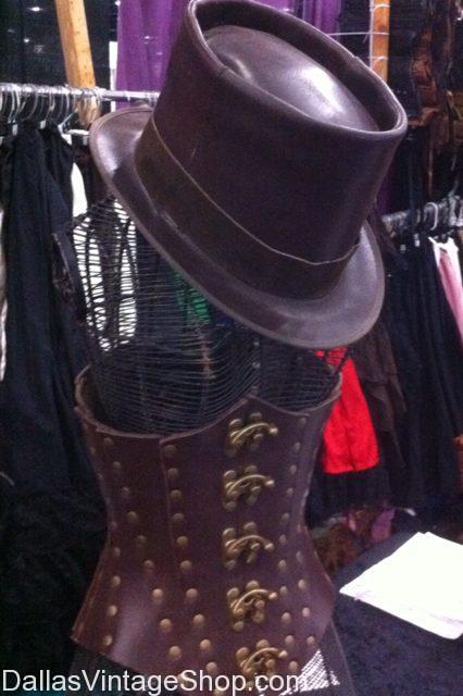 Great Costumes for Renaissance Fair start at Dallas Vintage Shop. Here you can find plenty of Steampunk, Medieval, Renaissance or Victorian Costumes and complete outfits or you can pick outstanding accessory pieces to build the theme or direction of your outfit. Consider costume pieces like these Leather Corsets and Leather Top Hats. If you prefer to economize we have faux Leather or pleather Corsets. Just come see us and you’ll be glad you did.