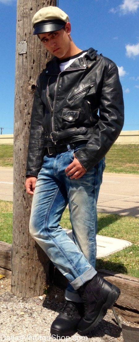 Marlon Brando, ‘The Wild One’ Movie Costume. For Supreme Costumes in Dallas you can always depend on us. This Marlon Brando, Johnny Strabler, iconic 1953 Movie, The Wild One character is excellent for ‘Hollywood Greats’ Theme Parties, Sock Hops, Theatrical or film productions. We have complete outfits for any of the old Classic Movies or historical events. This Movie was inspired by 1947’s’ Forth of July weekend events in Hollister, CA. There, the American Motorcycle Association’s bike rally got wild and the event became the inspiration for Frank Rooney’s short story about wild biker characters. Now the image of Brando in his biker getup is emblematic of that culture. We have biker jackets, leather jeans, chaps and everything you need to assemble amazing outfits like this one or any character from any movie imaginable.