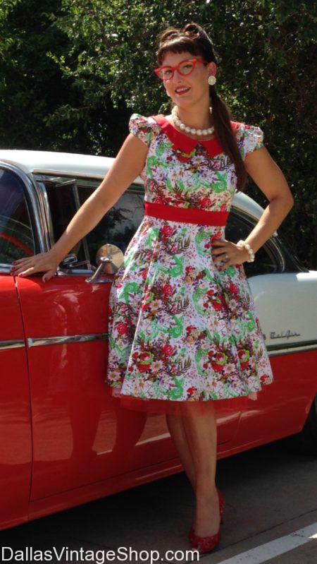 You’ll think you’ve died and gone to Pin Up Heaven. Dallas Pin Ups love our unbelievably enormous collection of Pin Up Dresses. We have the perfect shoes, wigs, gloves, jewelry, hats, eye glasses and stockings to go with each and every dress. We even have unexpected touches like period broaches and hair adornments.