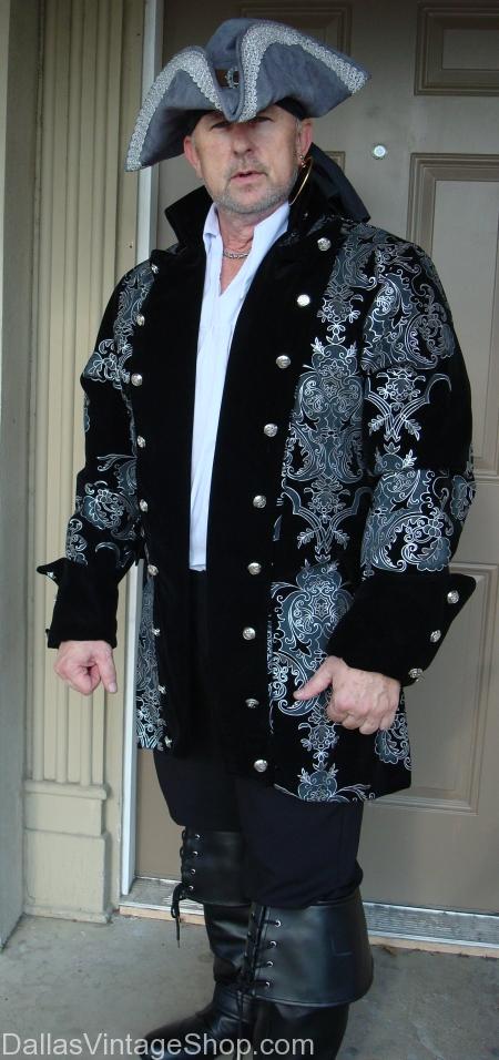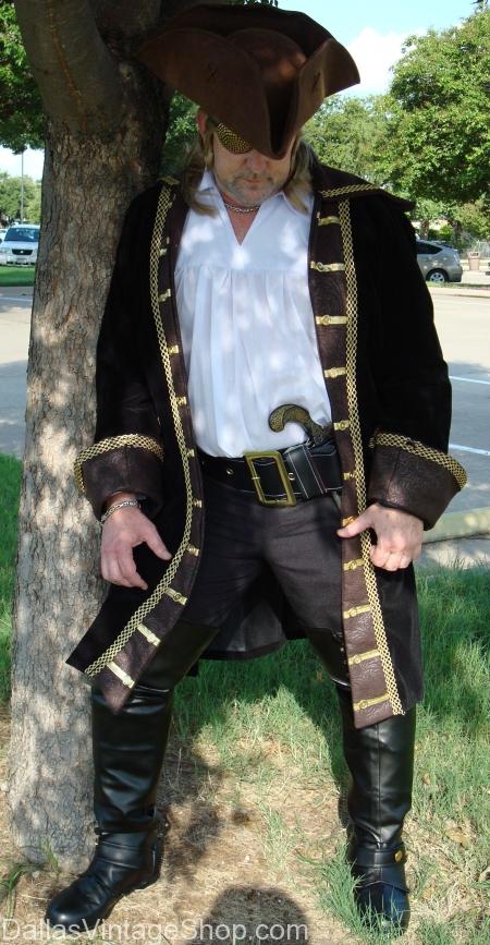 This Baroque Style Fancy Pirate Captain Outfit is just one style of Pirate Captain or Buccaneer outfit you can create from our huge collection of pirate clothing that we keep in stock. Dallas Vintage Shop has the most amazing selection of beautiful, quality pirate captain coats, jackets and vests. From Captain Morgan to rough and rowdy buccaneers, we have the pirate attire you want. You will find racks and racks of Colonial & Baroque pirate shirts, pirate pants, pirate hats, pirate belts, pirate boots and boot covers, pirate earrings, rings, pirate sashes, pirate swords, pirate guns and knives, pirate sword belts, pirate baldrics and more. Get high quality outfits or economy outfits for men, ladies and kids.
