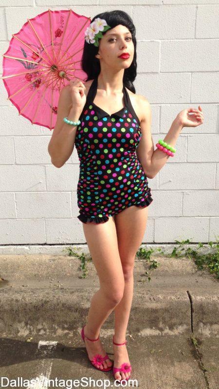Retro Tropical Attire like this Vintage Pinup Bathing Suit is sure to be a hit at the Tropical Hawaiian Luau. Throw a Retro Fashion Tropical or Tropical Pinup Theme Party and get all your Tropical Costumes here and Vintage Tropical Outfit Ideas here.