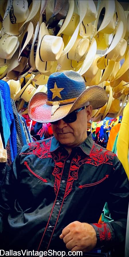Get Texas Flag Western Hats & Western Wear Outfits for special Occasions at Dallas Vintage Shop. We have the western hats, vintage western cowboy boots, western belts & big buckles, vintage & vintage style pearl snap shirts, cowboy & cowgirl Old West historical crease hats, concho belts, western theme shirts, western sear sucker suits, western vests, fancy western wear collar tips, bolo ties, cowgirl Old West blouses scarves and scarf holders, men’s western oversized silk or cotton bandanas in many prints, western banded collar shirts in many, many prints and patterns, western jewelry, western leather fringe coats & long coats, Western wear dusters & slickers, show boat cowboy & cowgirl outfits, leather or suede Wild West cowgirl skirts, western square dance & Rockabilly dresses, and much more than you would imagine.