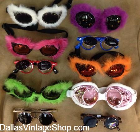 Look at all these Ubbi Dubbi Goggles with fur trim in bright colors. When it comes to Ubbi Dubbi, you can count on Dallas Vintage Shop to have some wild, fun and creative ideas. We have lumi glowing leg straps, neon & colorful mesh leggings and hose, crazy colorful leg warmers, sequin and lumi booty shorts & mini skirts, neon & mesh crop tops, sequin & bright colored scarves & belts, tons of bright colored wigs of every length & color imaginable, wings, halos, antlers & other head ornaments, crazy sun glasses, feather head pieces, shoulder pieces, bikinis, boas & rainbow colored everything you can imagine and more. There are so many unique ideas you would freak out.