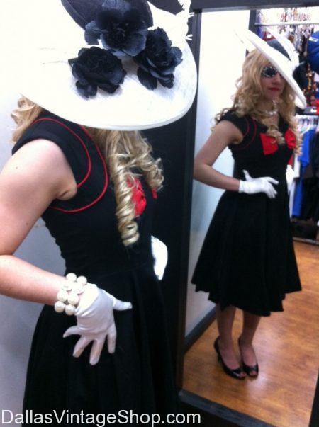 WARNING: Dallas Vintage Shop has true pedigree vintage attire. However, we also provide fancy theme party costumes for any decade, century or theme. We don’t claim to be the typical vintage boutique. Although we have enormous quantities of amazing vintage, we also provide theme party costumes with the, “Wow!” factor. Some people prefer vintage, but many prefer new. Therefore, we have quality replicas and costumes in vast quantities in a gigantic variety of styles with a large range of sizes. We have Ladies 50s-60s Fashions, Vintage 60s Ladies Attire, 1960s Mad Men Ladies Dresses, Ladies 50s-60s Cocktail Party Dresses and other great ideas.