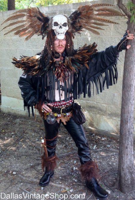 Mardi Gras Witch Doctor Costumes from Dallas Vintage Shop include; hats, headpieces, cloaks, capes, dresses, leggings and tops for ladies and pants and shirts for men. Any or all these items might be made from leather, fur, feathers, bones mesh and/or lace.