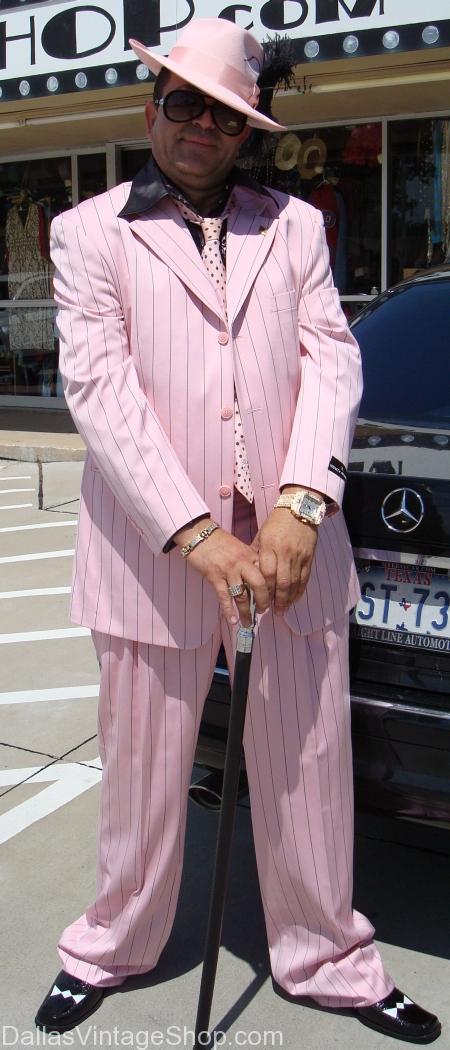 Dallas Vintage Shop is Zoot Suit Heaven. You will find every color imaginable, Pinstriped, Zoot Hats in all colors, Gangster Shoes in all colors, Gangster Ties & Pocket Squares, Zoot Chains, Cains & Bling. We have matching dresses and fabulous accessories for the ladies too.