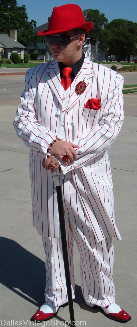 Check out this Killer White & Red Pinstripe Candy Cane Zoot Suit with Bling and Exceptional Accessories. There is absolutely no limit to the extravagance. Create the outfit of your dreams from our ridiculously huge selection of Gangster Suits & Zoot Suits we keep in stock. The Hats, Suits, Ties, Shoes, Canes & Zoot Chains are unlimited in choices. Nobody can Zoot or Suit you up like we can.