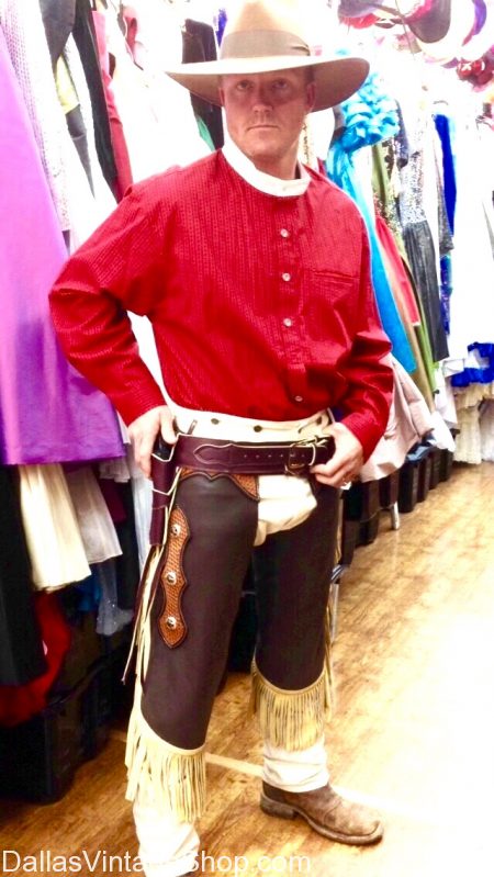 We have all the costumes for “Oklahoma!” the Rodgers & Hammerstein Production. We have costumes for all the cowboys and farmers. This Curly Costume is only one idea we have in stock for all the male characters, Real leather cowboy chaps and period dungarees, neck scarves, vests, boots, spurs and more. We have all you need for the ladies cast too. Any Broadway production, any movie, any characters.