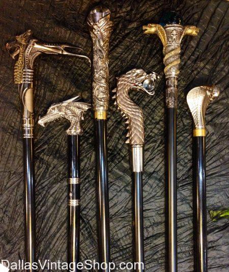 In our unlimited collection of Walking Canes, you will find many styles of Canes that are perfect for any Time Period Costumes, Cosplay Character Outfits, Movie Character’s Attire or for any Famous Historical & Fictional Characters imaginable. We have more styles of Walking Canes than any Costumes Shop or Clothing Store in the Dallas, DFW or North Texas Area. Get Ornate Walking Canes, Mystical Themed Walking Canes, Renaissance Themed Walking Canes, Dragon Head Walking Canes, Serpent Head Walking Canes, Medieval Themed Walking Canes, Snake Head Walking Canes, Fantasy Themed Walking Canes, Finely Detailed Walking Cains, Vampire Walking Canes, Wizards Walking Canes, Cosplay Character Walking Canes, Renaissance Period Walking Canes, Medieval Period Walking Canes, Pimp Daddy Walking Canes, Goth, Walking Canes Victorian Walking Canes the largest selection and variety of unique, elegant, mystical, intricate or fashionable Walking Canes you have ever seen. We keep all of these Walking Canes in stock all year round. And remember, we have the Historical Period or Fantasy Costume Characters Outfits and fabulous matching accessories for all these themes of Walking Canes. (♠)